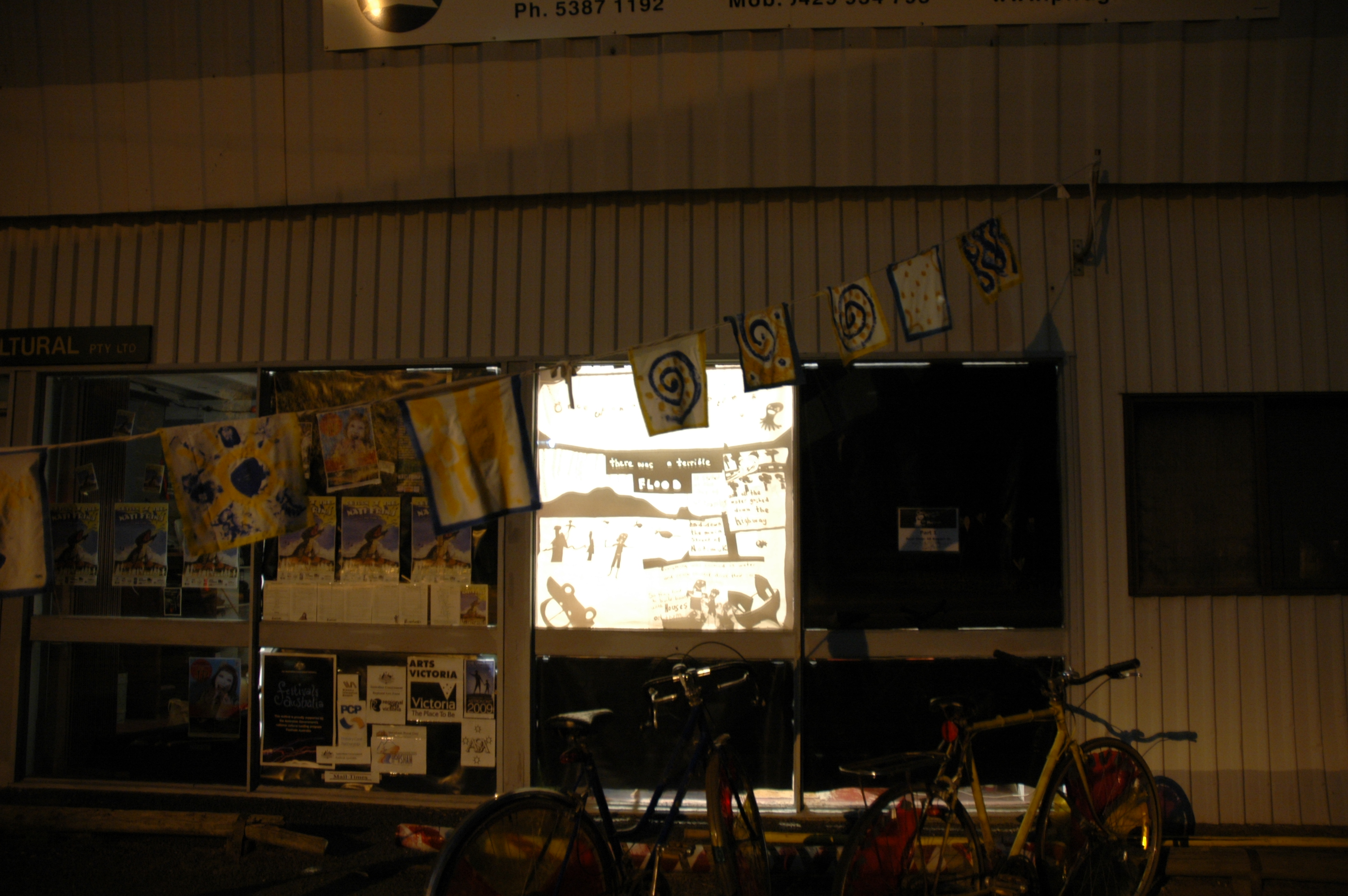 Together with the children of Natimuk, Hannah worked to create and illustrate the story of a terrible flood that completely covers the town of Natimuk. The public showing of the story was realised as a shadow installation in the windows of private homes around the town.